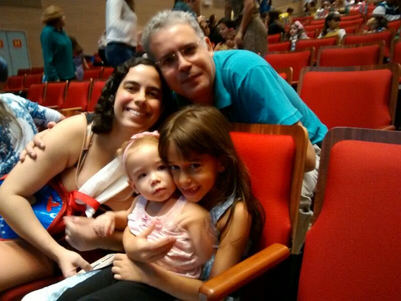 A nossa alegria em ver o desenvolvimento de Rafaela continua crescente... é lindo! Ela está durante as tardes em um hotelzinho... e percebemos as influências boas e ruins que o convívio com outras crianças traz... contudo, muito necessário e importante! A foto abaixo foi recente... fomos leva-la para assistir uma peça teatral de Peppa Pig... ela amou! Se comportou muito melhor do que imaginava... Mel já está com 7 anos, mas foi para acompanhar a priminha!